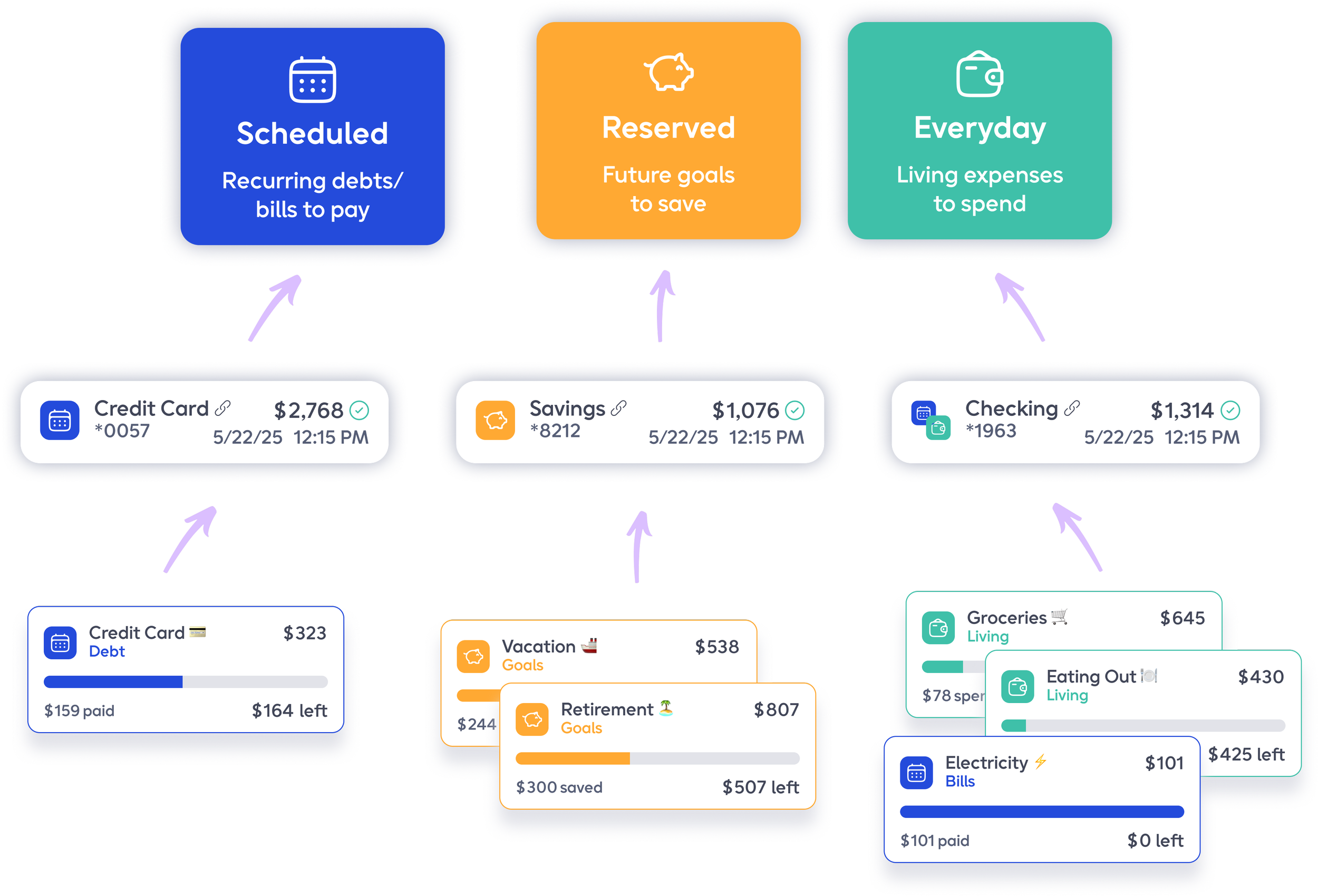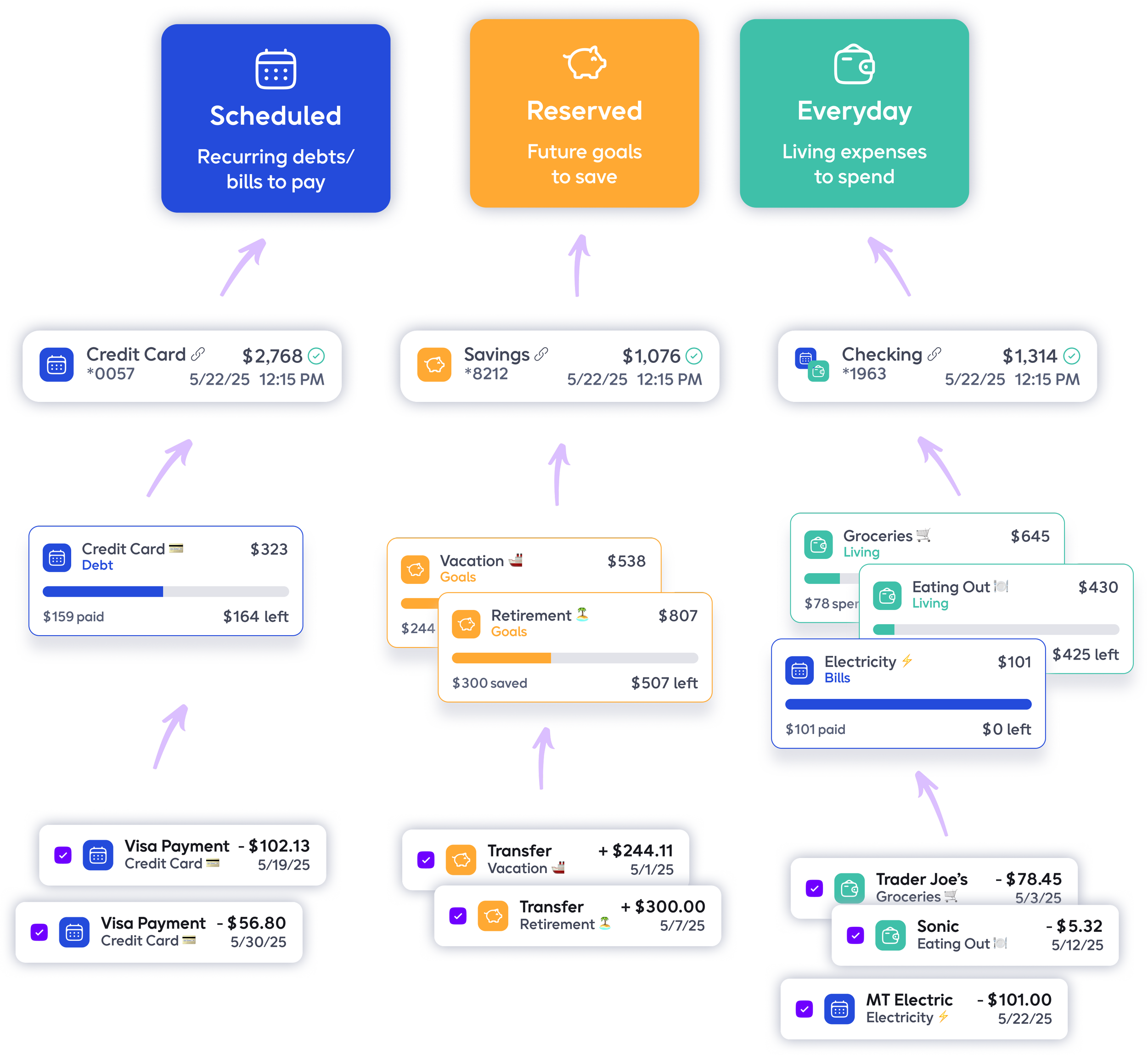 Each queue represents a different spending purpose for a portion of your monthly income.
